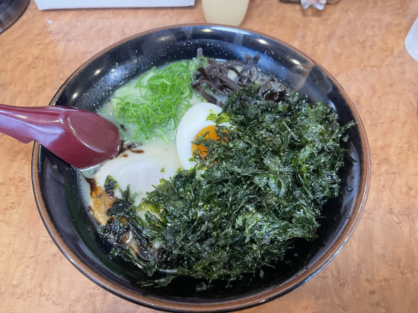 運ばれてきたとたん「黒とんこつらーめん」は、とんこつの香りとマー油(焦がしニンニク油)と